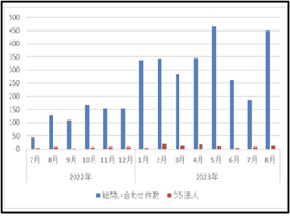 図:トレンドマイクロのサポート窓口におけるサポート詐欺関連のお問い合わせ総数と法人組織からの件数