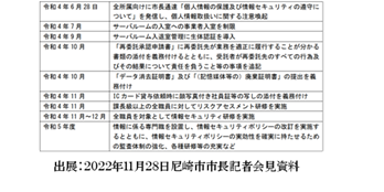 同市は同年11月に職員への教育の充実や情報セキュリティポリシーの改訂等を講じたと公表した(左図)。更に事故発生から1年後の2023年6月にも再発防止策の進捗状況及び今後の方針を公表している。委託先も社内規程の改定や従業員への教育の充実等の再発防止策を講じている。2022年6月に再発防止の方針を公表してからも約3か月に1度進捗状況を公表しており、現在も対応が続いている。
