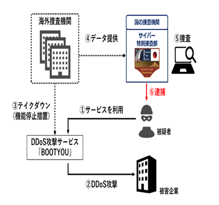 警察庁HPに、※「DDoS攻撃」における啓発メッセージが掲載された。※「DDoS攻撃」とはサーバやネットワークに、過大な負荷をかけて、利用不能な状態に陥らせる攻撃手法である。 メッセージには、実際の被害事例が掲載されており、海外のウェブサービス「BOOTYOU」の利用により、専門的な知見を有することのない者でも「DDoS攻撃」ができる環境への対策が呼びかけられた。 当該サービスは月額4・99ドル(約720円)から99・99ドル(約1万4470円)の利用料を支払い攻撃先を指定すれば、「DDoS攻撃」を実行することが可能なものである。 2000年代では、過大な負荷をかけるコンピュータを使用できるようにするための「DDoS攻撃」用ウイルスを準備できる知見と資金力が必要であったが、現代では、「DDoS攻撃」を代行してくれるサービスが出現したため、「DDoS攻撃」への対策が急務である。